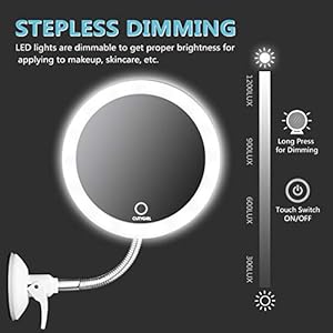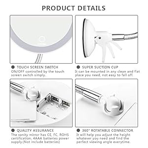 ★TOUCH SCREEN SWITCH&360 DEGREE ROTATABLE GOOSENECK DESIGN-ON/OFF controlled by the touch screen switch, long press for dimming. 360° rotatable adjustable flexible gooseneck will help you adjust the height whatever you need and find the perfect viewing angle everytime. No more need to climb to get close to the mirror.