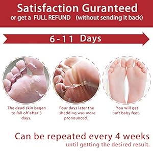 ?PAINLESSLY EXFOLIATOR FOOT MASK—-After using the foot peeling mask, you will witness your feet reborn with your own eyes. The dead skin will start peeling after 1-3 days, keep soaking your feet, about one week you will get baby soft feet skin, all dead skin and calluses will be removed. No pain during the whole process. You should feel it by your own.