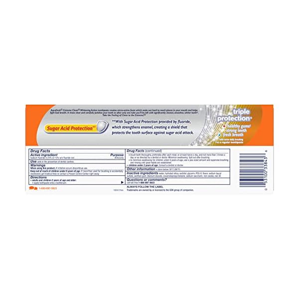 EXTREME CLEAN WITH MICRO-ACTIVE FOAMING ACTION + WHITENING whitening action Sugar Acid Protection** from Fluoride mint blast helps restore natural whiteness triple protection healthy gums† strong teeth fresh breath †with twice daily brushing *vs. a regular toothpaste Aquafresh Extreme Clean Whitening Action toothpaste creates micro-active foam which seeks out hard to reach places in your mouth and helps fight bad breath. It rinses clear and carefully polishes your teeth so after only one tube you will be left with significantly cleaner, smoother, whiter teeth*. Take the Feeling of Clean to the Extreme! **With Sugar Acid Protection provided by fluoride, which strengthens enamel, creating a shield that protects the tooth surface against sugar acid attack.