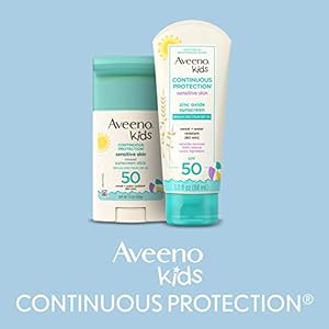 3-fluid ounce travel-size tube of Aveeno Kids Continuous Protection Sensitive Skin Sunscreen Lotion with SPF 50 for superior broad spectrum protection from harmful UVA and UVB rays for your child’s skin