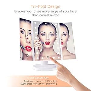 21 LED Lights: Our lighted mirror is built in 21 pcs LED. Led lights are controlled by the touch sensor switch. Long press can adjust the brightness. This allows you makeup in the dark or poorly lit areas as well.Fill the light for you need.