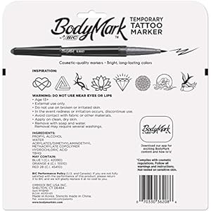 Express yourself on skin with Body Mark by BIC temporary tattoo markers. Unlike permanent markers and other inks not meant for drawing on the body, Body Mark Tattoo Markers allow you to create fun and unique designs that are skin-safe (Complies with cosmetic regulations follow all warnings and instructions Not tested on sensitive skin) Test out a tattoo design without the pain or commitment or just use them for fun Great for parties festivals Halloween costumes or anytime you’re feeling creative! Collect all the bright and vivid color options and see what you can create.