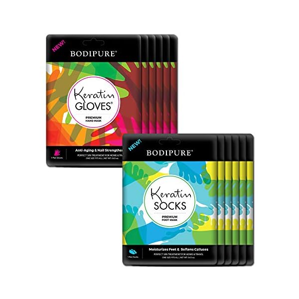 SPECIFICATIONS: Pack of 6 Keratin Hand Gloves Pairs and 6 Keratin Foot Socks. Active ingredients are derived from 100% vegetable, 100% renewable sources. Great for home use or travel.