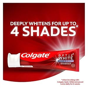 Colgate Optic White Advanced Sparkling White Toothpaste deeply whitens for up to 4 shades when brushing twice daily for 6 weeks. This teeth whitening toothpaste contains 2% hydrogen peroxide, a professionally recommended whitening ingredient proven to deeply whiten beyond surface stains. This vegan toothpaste is good for daily use, enamel-safe, and the fluoride toothpaste formula provides protection against cavities. The cool, herbal minty wintergreen flavor will help keep your breath fresh. Get a brighter, whiter, bolder smile with Colgate Optic White Advanced Sparkling White Toothpaste.