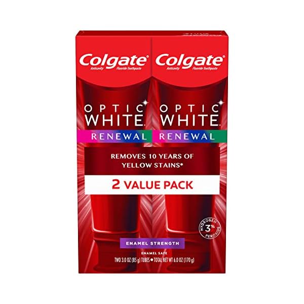 Colgate Optic White Renewal Enamel Strength is our best teeth whitening toothpaste ever. It contains 3% hydrogen peroxide, a professionally recommended whitening ingredient proven to deeply whiten beyond surface stains. With unprecedented whitening power, this toothpaste removes 10 years of yellow stains when brushing twice daily for 4 weeks. It’s enamel-safe whitening technology makes it safe for daily use. Plus, the fluoride toothpaste formula helps to prevent cavities and strengthen enamel. Meanwhile, the cool, minty wintergreen flavor will keep your breath fresh. Get a renewed, whiter smile with Colgate Optic White Renewal Enamel Strength Teeth Whitening Toothpaste.
