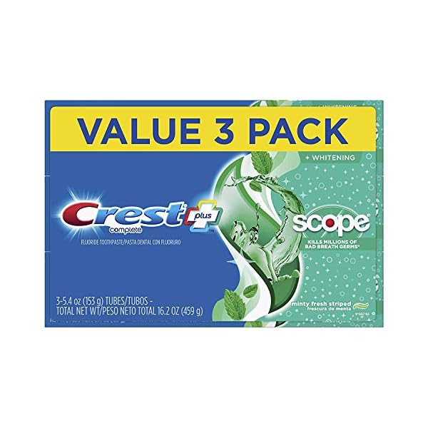 Includes three 5.4 oz cartons of Crest + Scope Complete Whitening Toothpaste
