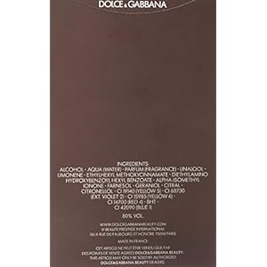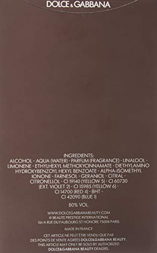 Dolce and Gabbana The One EDT for Men, 3.3 oz. Ingredients: Alcohol Denat., Parfum/Fragrance, Water/Aqua/Eau, Benzyl Benzoate, Benzyl Salicylate, Butylphenyl Methylpropional, Citronellol, Coumarin, Geraniol, Hydroxycitronellal, Limonene, Linalool, Butyl Methoxydibenzoylmethane, Ethylhexyl Methoxycinnamate, and Ethylhexyl Salicylate.