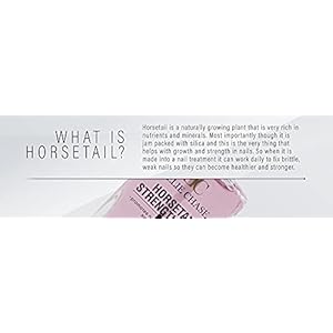 No formaldehyde, toluene or DBP. Works great on nails that break, crack, chip, split and have no flexibility. Specialized formula conditions, strengthens & hardens nails while also promoting nail growth. Helps normalize the natural nail plate so nails grow longer & stronger. Horsetail is rich in nutrients & high in silica to promote strong healthy nails. Use as basecoat, topcoat or alone as a nail treatment. 0.5 fl oz Made in USA.