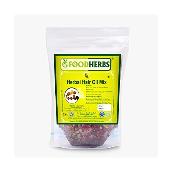 Foodherbs Natural Herbal Hair Oil Mix (jadi boti) – Premium Pack: INGREDIENTS: (Common and Hindi Name) – 1. Vetiver – Khus Khus (Usheera). 2. Champaca seed – Champak 3. Fenugreek – Methi 4. Marorphal – Valampiri 5. Idampuri 6. Poolankilangu – Chandramoolika 7. Curry Leaves – Kari pattu 8. Ranawara – Tarwar 9. Hibiscus – Japa 10. Vembalam Bark plus 8 vital herbs for hair care. USES AND BENEFITS: 1. Prevents hair fall. 2. Prevents gray hair. 3. Prevents dandruff. 4. Reduces body heat. 5. Regular use gives thick and long hair. MAKE YOUR OWN HERBAL HAIR OIL IN JUST 3 SIMPLE STEPS: STEP 1: Open the pack and put the herb mix in a container. STEP 2: Fill the container with 1 Ltr (33 Oz) of coconut oil or any preferred essential oil. Make sure the herbs get completely soaked in the oil. Leave the mixture for 5 to 6 hours. STEP 3: After 5 to 6 hours, your herbal hair oil is ready and you can start using it by straining the oil. REFILL INSTRUCTIONS: Once the oil reaches half the container, refill the container with oil. Max 2 refill is recommended. APPLICATION INSTRUCTIONS: A gentle massage after application of the herbal hair oil is recommended. The oil can be used at any time but using it in the night and washing in the morning is suggested. Regular usage for 2-3 months gives amazing results. No restrictions, any age can use the oil as it is completely natural. 100% CUSTOMER SATISFACTION IS GUARANTEED. The herbs can also be grounded and can also be used as hair packs. The oil strained from the herb mix can also be used for head massages.