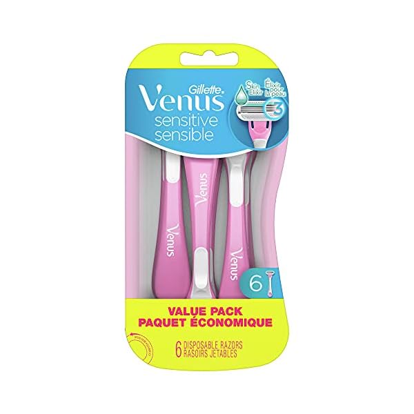 Venus female razor blades are designed with a woman’s body in mind. Venus Sensitive women’s razors are made for women with sensitive skin. These women’s disposable razors feature 3 curve-hugging blades for a shave with up to 0% irritation* and cut hair closer to the skin, for a shave that keeps your skin protected. *US Consumer Study, Feb. 2018. Designed with a soft-grip gel handle and 3 blades for a close and comfortable shave.