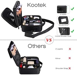 Double Layers: Kootek cosmetic bag is designed in two layers (10*9*4.8 inch), ideal for providing plenty of space to holds your makeup, brushes, full sized bottles and big eyeshadow palette!