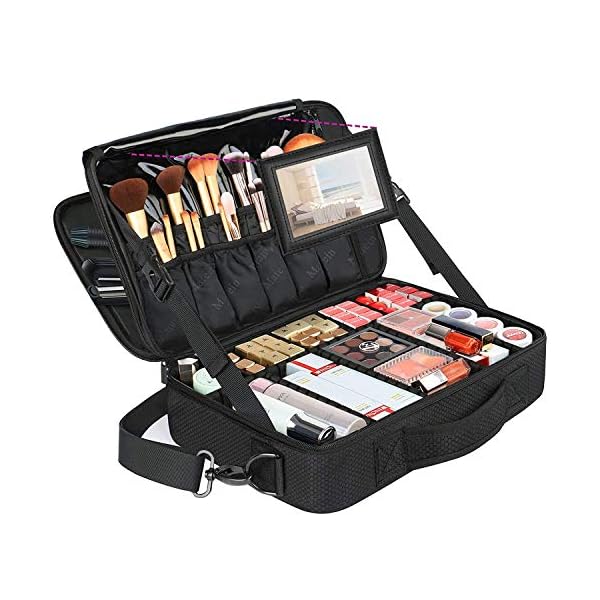 Large Makeup Bag with Mirror: This is a 3 layers cosmetic case organizer, your best choice for a makeup storage bag. The first main compartment includes 10 adjustable dividers, DIY your need, fit for lipstick, eyeshadow, electronic accessories, etc; The second large makeup brushes holder with plastic cover, give your brushes a safe “home”, easy to wipe clean; The third hidden pockets and mesh compartment are suitable for privacy items when travel