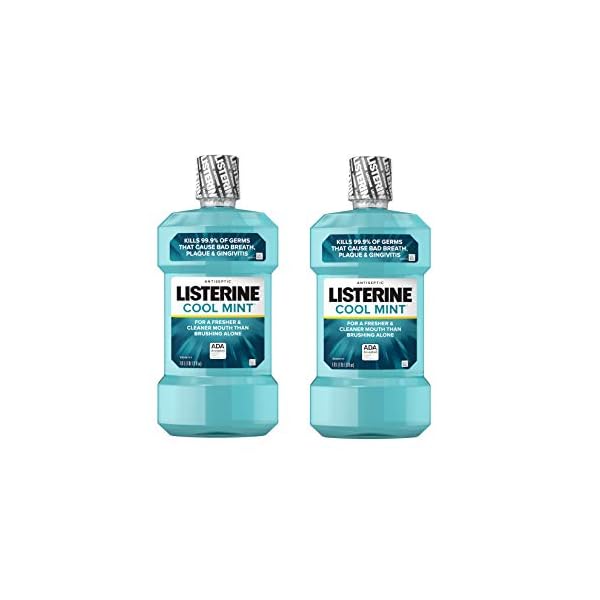 Pack with two 1-liter bottles of Listerine Cool Mint Antiseptic Mouthwash kills 99.9% of germs that cause bad breath, plaque and gingivitis for a fresher and cleaner mouth than brushing alone