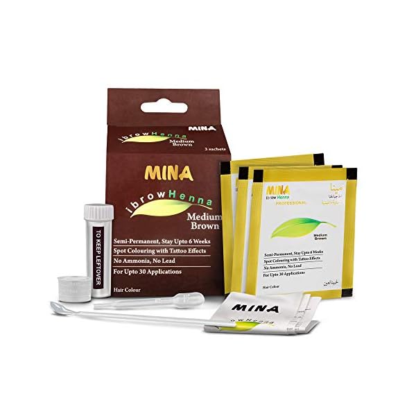 Mina Ibrow Henna Medium Brown Regular pack will give your hair a beautiful and elegant Medium Brown coloration effect. This Ibrow henna kit contains 3 sachets of ibrow henna powder where one sachets can color up to 8-10 sets this means one box can color 25-30 sets. This will effectively covers resistant grey and also gives the spot coloring with coloring effects to the ibrow. The Mina ibrow henna has no ammonia, no lead and free of all heavy metals. The kit contains: 3 sachets of ibrow henna powder, Measuring cup, Spatula,Bottle to keep leftover ibrow henna powder, instruction leaflet, dropper.