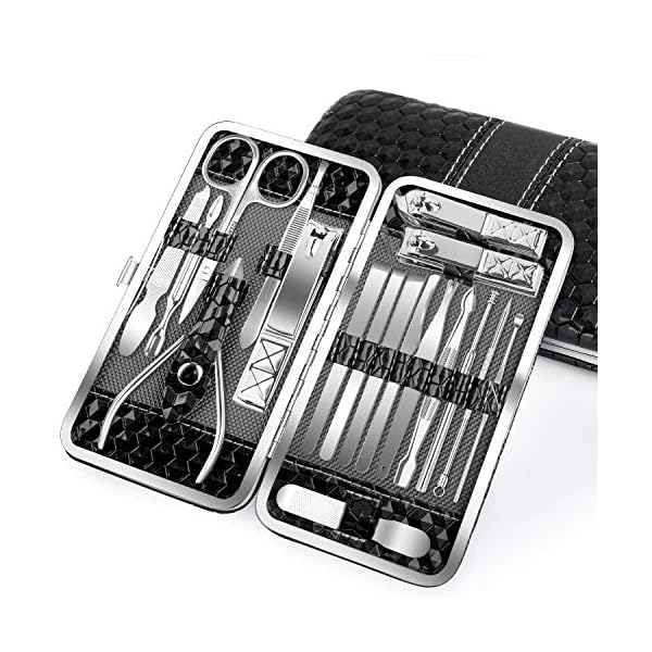 【Product Contain】18 in 1 MANICURE KIT Includes Large nail clipper, medium nail clipper, oblique nail cutter, manicure plier, Cuticle knife, acne needle, Oblique Pedicure Knife, scraper, Large scraper, nail file, Eyebrow Clip, Eyebrow Hair Scissors, dig ear spoon, Spiral Ear Pick, Remove Dead Skin Scraper, Scraping Cutter, Double Pick, Finger Nail File.