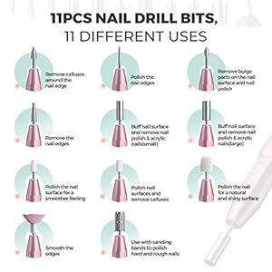 Multi function nail drill kit, 11pcs different nail drill bits and 30pcs sanding bands, which are used for easily grinding, carving, cutting, polishing, removing gel polish and cuticles