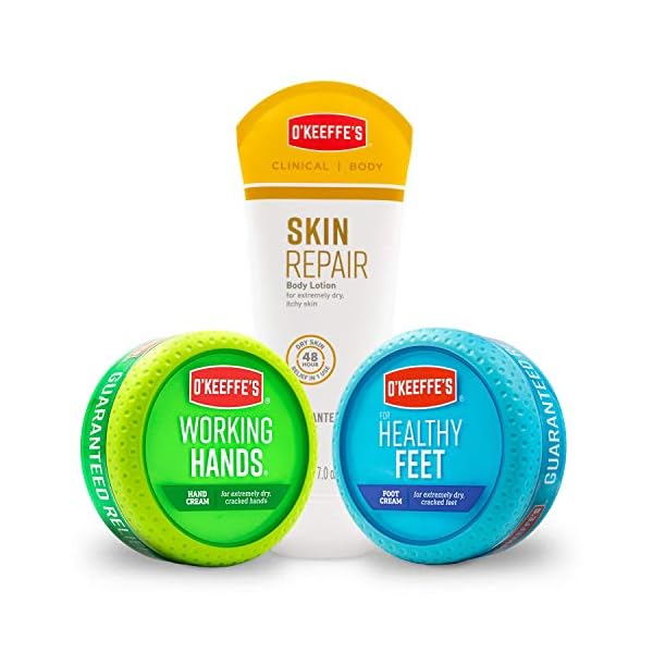 Hand, foot and body care set with three full size O’Keeffe’s products including Working Hands 3.4oz Jar, Healthy Feet 3.2oz Jar and Skin Repair 7oz Tube