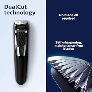 The Philips Norelco Multigroom 3000 is a all-in-one trimmer with everything you need, and nothing you don’t. Our toughest multipurpose trimmer boasts tempered steel cutting blades that self-sharpen and won’t rust. The trimmer includes 13 pieces to trim your face and head, including a full-size steel trimmer, steel detailer, nose and ear trimmer, 3 hair cutting guards, 3 beard trimming guards, 1 stubble trimming guard, and a storage bag. The durable trimmer includes impact-resistant cutting guards, a steel reinforced motor, and a powerful lithium battery delivering 60 minutes of run time. The blades and guards can be rinsed clean, and the device comes with a 45 day risk-free trial and a full 2-year warranty.
