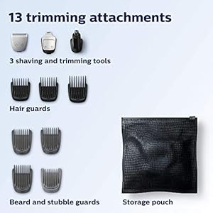 13 attachments for all of your grooming needs: Full size steel trimmer, a steel precision trimmer, a nose and ear hair trimmer, 3 hair trimming guards, 3 beard trimming guards, a stubble guard, an accessory travel storage bag, and a cleaning brush. Unlike competition, no oil needed to maintain high quality performance Blades and Guards are easy to detach and rinse