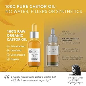 100% pure + extra-virgin + certified organic: Unlike regular castor oils that are made from older, lower quality castor beans, manufactured for kitchen rather than cosmetic grade, chemically deodorized to hide smells, or diluted with water, we hand-select and hand-process only the freshest seeds with the optimal ripeness (vibrant red) for maximum effectiveness.