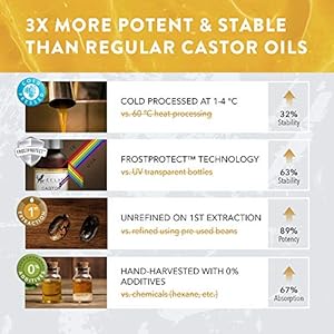 3X more stable than regular castor oils: We cold-press the castor beans at 1-4°C (vs. 60°C+ of regular castor oils) to preserve the most valuable, heat-sensitive micronutrients and micro-stabilizers. Our patented UV-protective FrostProtect glass bottle further ensures optimal stability & sustained potency.