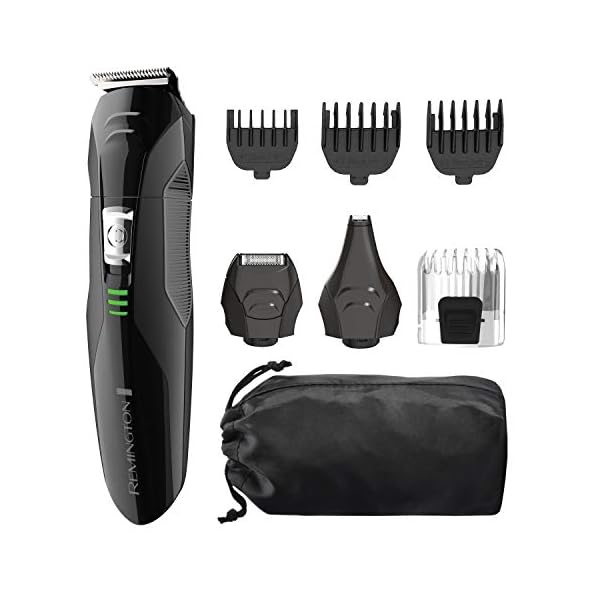 Color:Black The REMINGTON All-In-One Grooming Kit gives you the power of precision with complete versatility for all of your grooming needs. The kit includes: a full- size trimmer; foil shaver; nose, ear and detail trimmer; hair clipper comb with 8 length settings; three beard and stubble combs; and a storage/travel pouch. The rechargeable lithium battery provides up to 70 minutes of cordless runtime. Achieve the style you desire with self-sharpening, surgical steel blades that stay sharp and are long-lasting. The textured grip fits firmly in your hand for ultimate control at any angle. The washable attachments can be rinsed under a faucet for easy cleaning.