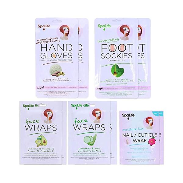 10 PIECE SET – Includes two cucumber aloe face wraps, two avocado vitamin e face wraps, two pairs of moisturizing hand gloves, two pairs of invigorating foot sockies, and two sets of cutucle wraps
