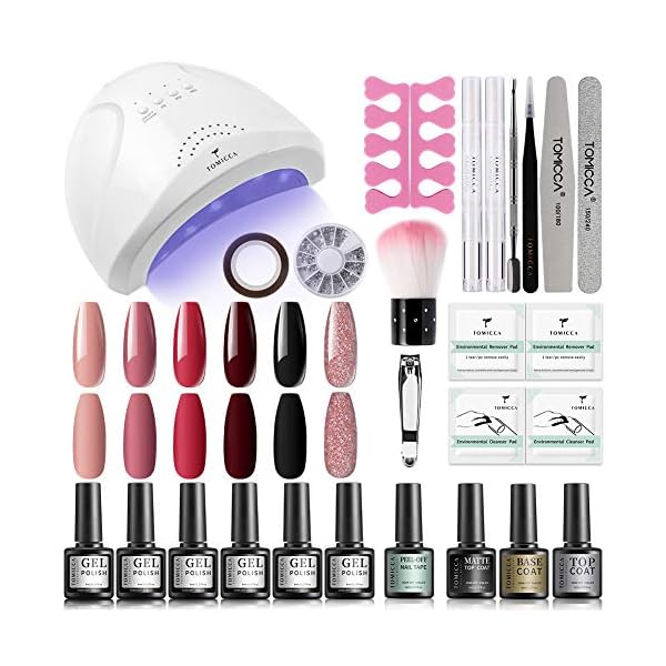 DIY Fun with Nail Polish Starter Kit: For TOMICCA gel nail polish kit with UV/LED lamp, you can enjoy nails art at home with the ALL-IN-ONE gel nail polish set, which include 48W UV nail lamp, 6 trendy colors gel polish, no wipe base top coat and matte top coat, peel off nail tape,12 kinds of manicure tools.