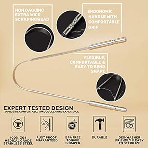 100% Stainless Steel Ensures Improved Taste: This gentle, 100% medical grade tool can keep you plaque free, spruce up your taste buds and help you enjoy every last bite. The tough & sturdy, non-toxic, material is not naturally susceptible to rust or mold, making it super durable and easy to clean – just put it in a dishwasher or opt for gentle hand wash