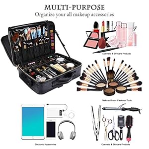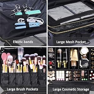 ♔Adjustable Compartments: This make up bag have 10 adjustable EVA dividers and 12 makeup brushes slots. You can design the internal compartments by adjusting the dividers to fit different cosmetics and keep them perfectly separated and organized.
